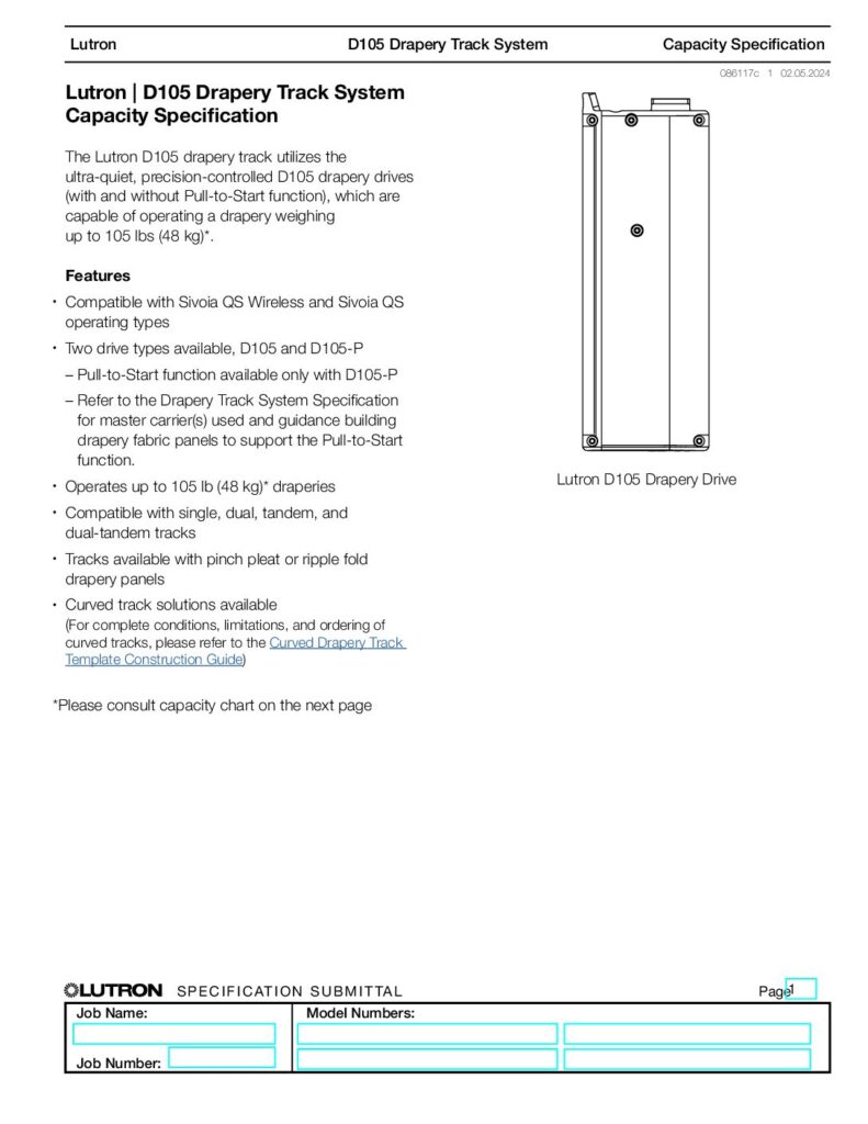The Lutron D105 drapery track utilizes the ultra-quiet, precision-controlled D105 drapery drives (with and without Pull-to-Start function), which are capable of operating a drapery weighing up to 105 lbs (48 kg)*.